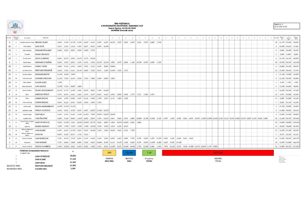 Od ukupno ulovljenih 290 riba prosječne težine 7,15 kg najtežu ribu je ulovio Kristijan Mesaroš i ona je težila 15,40 kg.