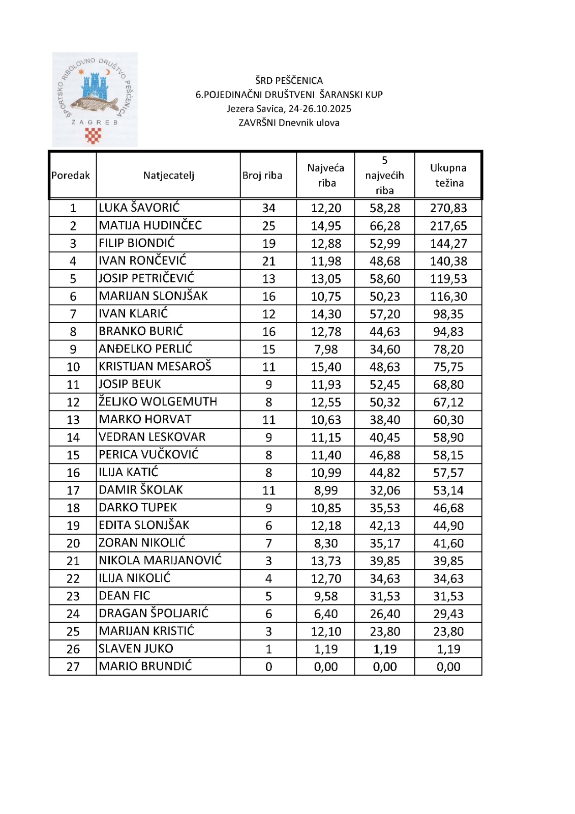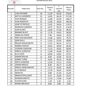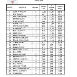 Ulovljeno je ukupno 2.073 kilograma ribe i na kojemu je prvo mjesto uzeo Luka Šavorić sa ulovljenih 270,83 kilograma ribe.